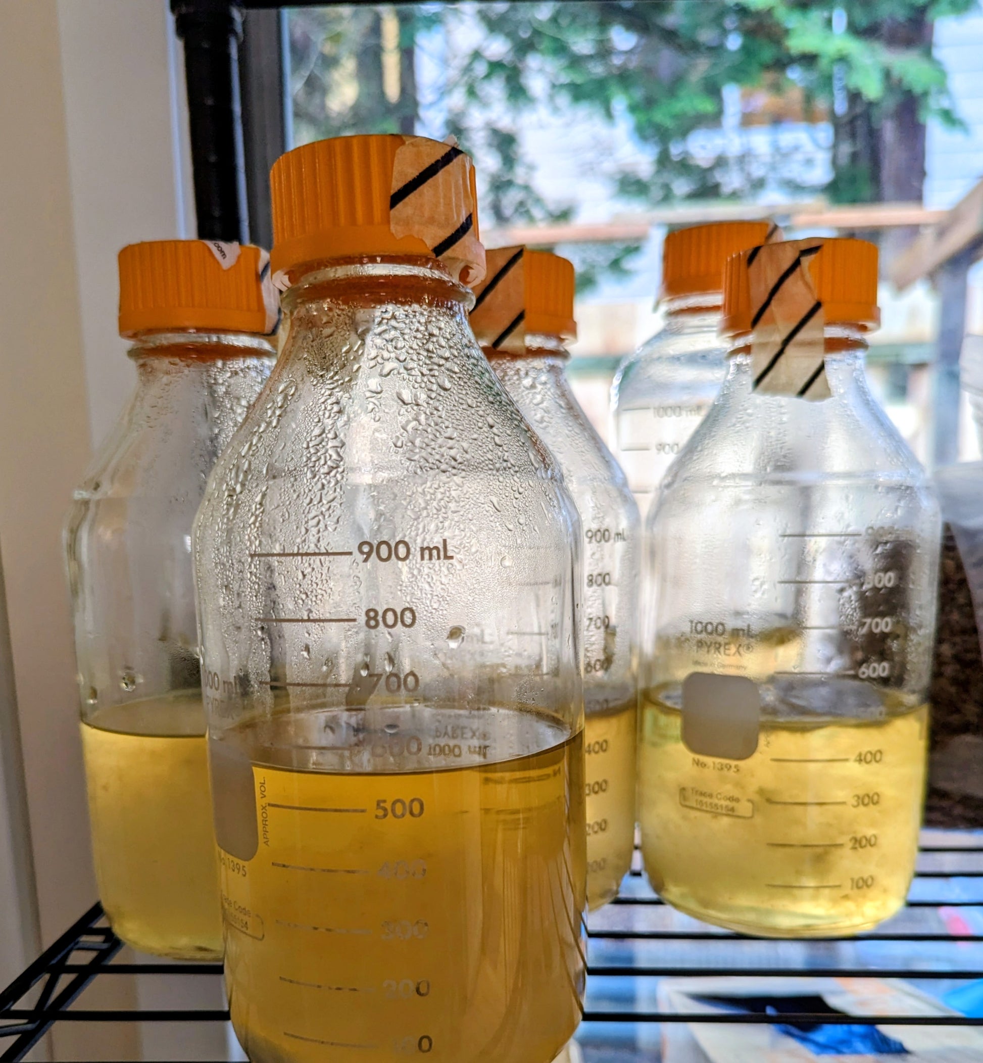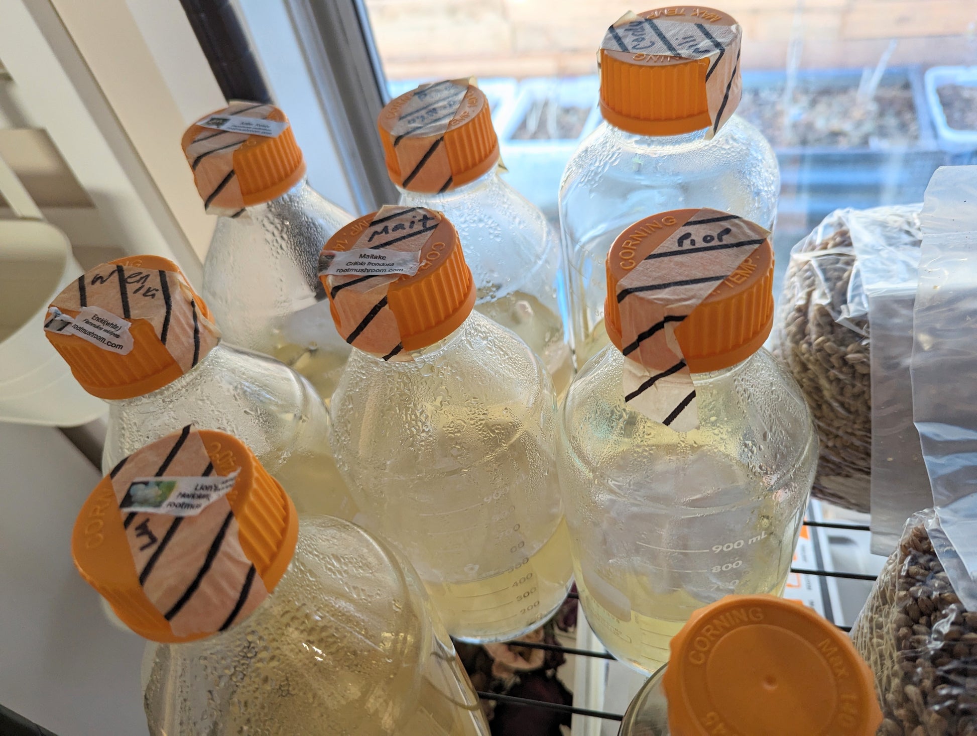 The liquid spores are of different gourmet mushrooms for consumption. Common and rarer strains mix.